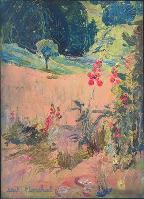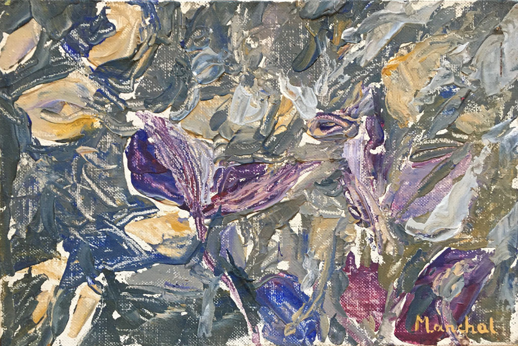 1989 Peinture Acrylique sur Carton entoilé -L 30 cm X H 20 cm Titre Clématites de Guermange (57) -Année Env. 1989 Artiste Danielle STEIL MARCHAL